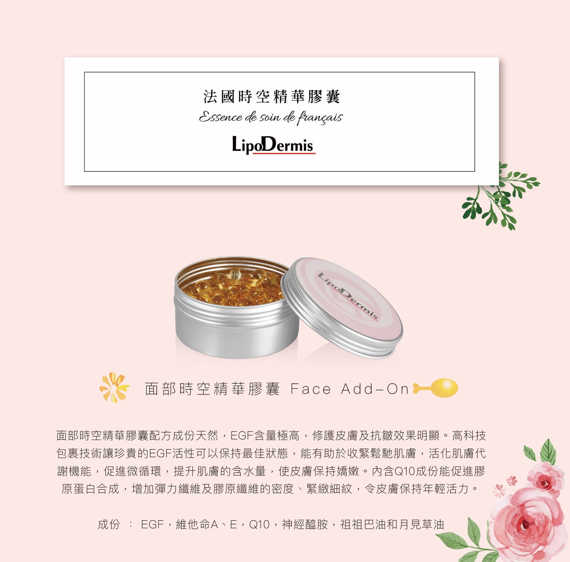 法國LipoDermis Face Add-On LipoDermis 面部時空精華膠囊 (0.3ml x150caps) 呢款試左好正同好滑,一d都唔苙身,而且獨立一粒粒方便又衞生,一盒可用到4-5個月👍👍 配方成份天然,EGF含量極高, 修護皮膚及抗皺效果明顯。 高科技包裹技術讓珍貴的EGF活性可以保持最佳狀態, 能有助於收緊鬆馳肌膚,活化肌膚代謝機能, 促進微循環,提升肌膚的含水量,使皮膚保持嬌嫩。 內含Q10成份能促進膠原蛋白合成, 增加彈力纖維及膠原纖維的密度、緊緻細紋, 令皮膚保持年輕活力。 採用高科技包覆技術, 讓 EGF 珍貴的活性能保持最佳狀態 , 成份天然 EGF 成份極高 修復皮膚及抗皺 , 有助緊緻鬆弛皮膚 , 活化新陳代謝能力 , 促進微循環 充份提升肌膚水含量 , 使皮膚保持嬌嫩抗衰老 。 內裡更含維他命 A 及 Q10 兩大殿堂級抗皺成份 , 配合 EGF 生長因子 , 加速修復 , 可達到高效逆齡效果 產品成份及功效: 📌生長因子 EGF 由 53 種胺基酸所組成 , 加速表皮細胞修護能力達到修補增生肌膚表層細胞 , 對受損之表皮肌膚擁有絕佳之療效 📌維他命 A / 維他命 E 高效去皺抗氧化 , 促進皮膚癒合及減少疤痕形成 , 延緩細胞老化現象 , 並保護細胞 📌輔酶 Co Q10 主要保護細胞膜與脂肪層 , 並有護膚功效防禦紫外線傷害 、 阻止自由基對健康细胞攻擊 📌神經酰胺 Ceramides 天然保濕因子 , 能協助建構皮脂膜 , 強化肌膚保濕能力 📌月見草油 Evening Primrose Oil 具修復皮膚問題 , 其所含之 y - 次亞麻油酸會在肌膚形成防護膜 , 抑制發炎過敏等情形 同時調節肌膚細胞代謝與皮脂分泌 。 使用方法 : 一般潔膚程序後 , 拆開膠囊後塗上全面 , 按摩至完全吸收 。 每一粒可以分早晚使用,開封後最好24小時內用完 聲明:所有帖文內容只作分享及參考用途。為免混淆視聽,所有商標或版權均屬有關商品品牌商標的持有人,敬請留意。 成份 : EGF,維他命A、E,Q10,神經醯胺,祖祖巴油和月見草油